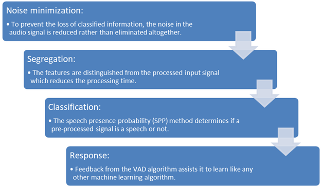 Voice activity detection (VAD) is the process that distinguishes human speech from the audio signal and background noise. VAD is further utilized to improve the optimization of overall system power consumption otherwise; the system needs to be active all the time, resulting in unnecessary power consumption. The VAD algorithm can be subdivided into four stages (Figure 1):